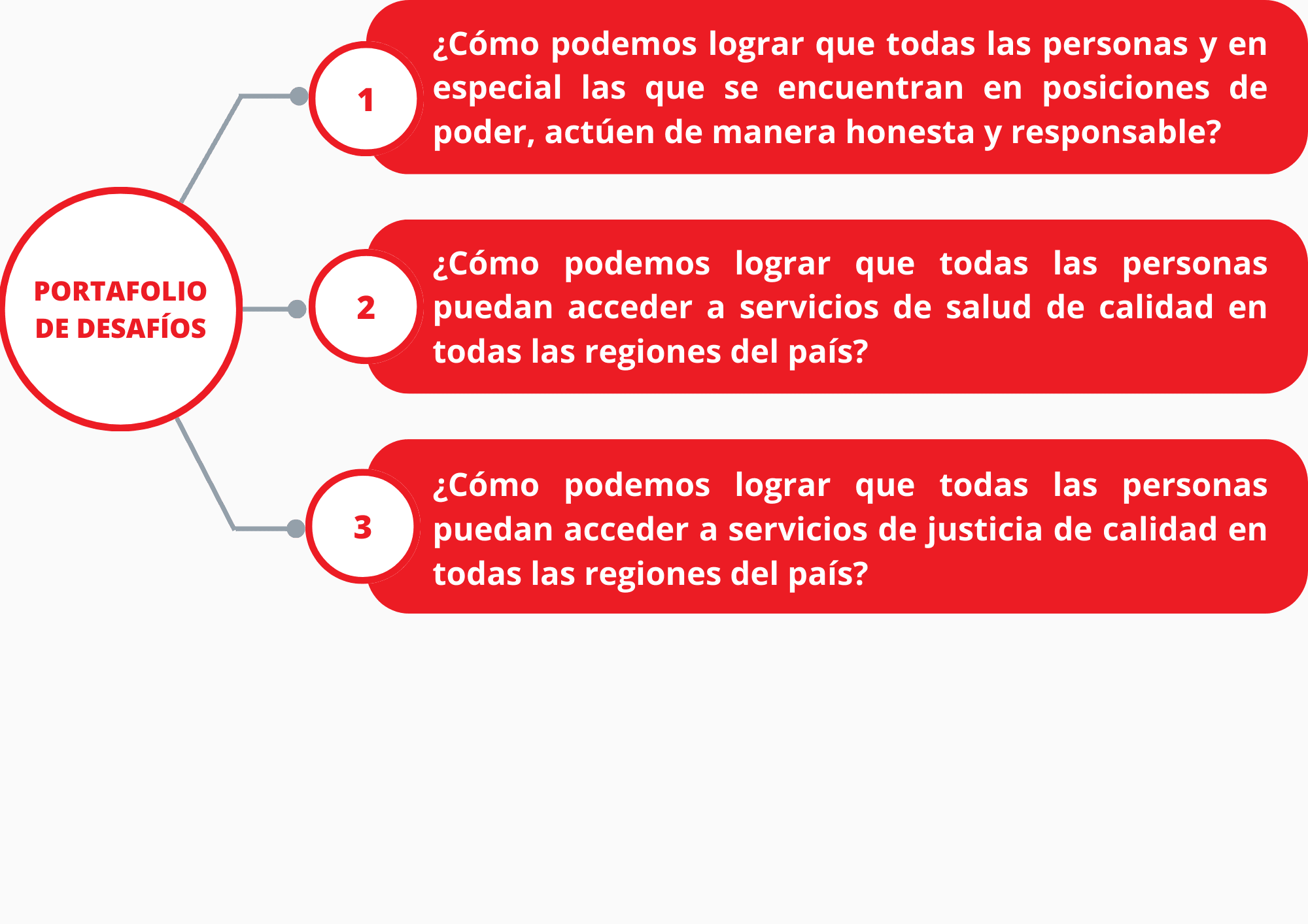 Un desafío es un problema prioritario y complejo que a pesar de muchas iniciativas y esfuerzos, no se ha logrado resolver. Aquí se presentan los 10 grandes desafíos del Perú en los cuales deberíamos enfocarnos como sociedad (empresas, sector público, universidades, sociedad civil) para buscar soluciones innovadoras. Cada desafío presenta los principales documentos de referencia que deberíamos tener en cuenta para comprender su complejidad así como las principales iniciativas de la sociedad civil, empresas y sector público para buscar resolverlos.