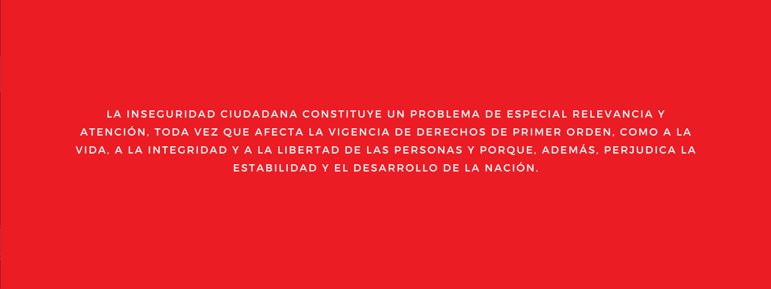 La seguridad ciudadana en el Perú se ve desafiada por la presencia de delincuencia, violencia y la percepción generalizada de inseguridad en algunas áreas. Fortalecer la presencia policial y diseñar estrategias de prevención del delito son cruciales. Además, abordar las causas subyacentes de la criminalidad, como la pobreza y la falta de oportunidades, es esencial para crear comunidades más seguras. La participación ciudadana activa y el fortalecimiento de los lazos comunitarios también pueden desempeñar un papel crucial en la construcción de entornos más seguros y resilientes. Es así que la inseguridad ciudadana constituye un problema de especial relevancia y atención, toda vez que afecta la vigencia de derechos de primer orden, como a la vida, a la integridad y a la libertad de las personas y porque, además, perjudica la estabilidad y el desarrollo de la nación.