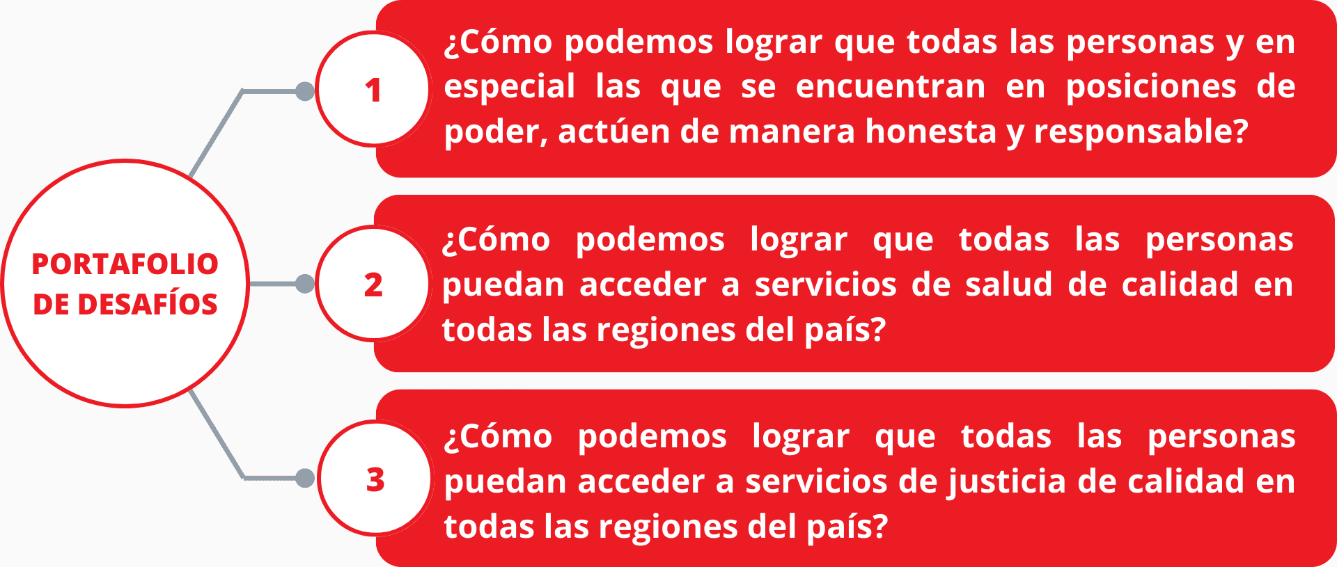 Un desafío es un problema que aún no se ha logrado resolver y que su solución tendría un gran impacto en los objetivos del ecosistema. El portafolio es el conjunto de desafíos que han sido priorizados por la comunidad de actores que forma parte del ecosistema. En el caso de nuestra querida comunidad Perú, se presentan los 10 grandes desafíos que enfrentamos para lograr los objetivos estratégicos y alcanzar la ansiada gobernabilidad democrática y el desarrollo sostenible Son estos desafíos los que deben ser propulsados con fondos públicos buscando catalizar las energías, creatividad e innovación de las empresas y la ciudadanía para la co-creación de soluciones.